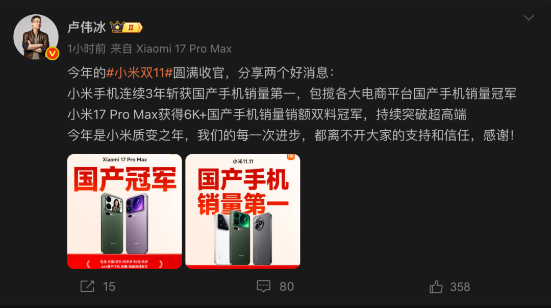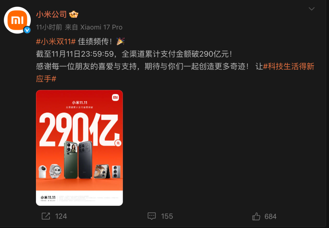 11月12日,集团手机部总裁卢伟冰发布微博称:今年的小米“双11”圆满收官,小米手机连续3年斩获国产手机销量第一,包揽各大电商平台国产手机销量冠军;小米17 Pro Max获得6000元档国产手机销量、销额双料冠军,持续突破超高端。此前,小米公司微博表示,截至11月11日,小米“双11”全渠道累计支付金额突破290亿元。
