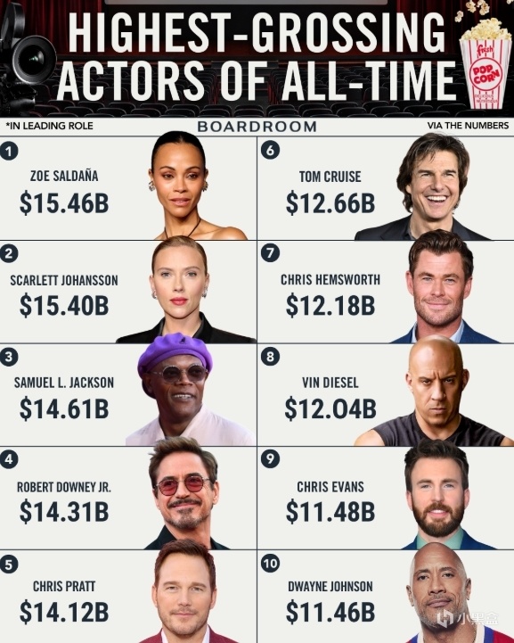 据国外票房网站发布的影史主演演员累计票房排名,来看看都有谁: